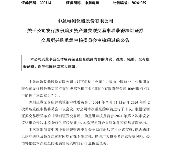 11日■■★◆,中航电测发行股份购买航空工业成都飞机工业(集团)有限责任公司项目100%股份事项■★★■■■,获深交所并购重组委审核通过,交易金额174亿元,是试点注册制以来交易金额最高★◆◆★、规模最大的深市重组项目,也是新◆★■★★“国九条”“科技企业16条”发布后■◆■,资本市场精准支持科技创新领域资产并购重组的典型案例。